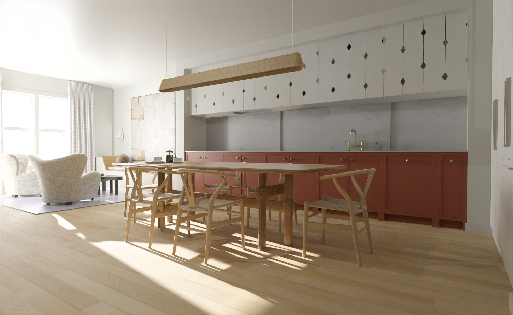 The homeowners of this fresh and simple kitchen desired two things: 1) a design that was reminiscent of their travels to quaint towns throughout Denmark and Sweden, and 2) a kitchen that hardly looked like a kitchen at all. In order to achieve this we used clever techniques to hide the kitchen’s eyesores like bulky stainless steel appliance fronts and unsightly countertop gadgets nearly completely. The marble backsplashes slide to the side to reveal niches for everyday kitchen items which are easily stowed once used. The double ovens are hidden behind pocket doors, while the dishwasher, fridge, and freezer all have custom panels to mimic cabinetry. Even the hood that sits over a streamlined induction cooktop is cleverly masked to look like upper cabinets. These uppers were inspired by Swedish flat sawn balusters that are typically seen as porch railings—the clients love the subtle texture they bring! And due to massive amount of storage space provided by the floor to ceiling cabinetry on the far wall, we elected to swap the typical island for a lighter feeling dining table. This cozy eat in kitchen with adjoining morning coffee nook is the embodiment of easy Scandinavian design.